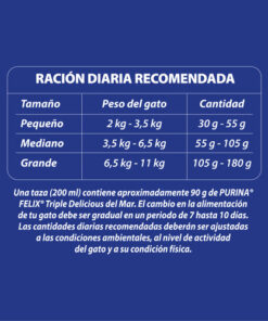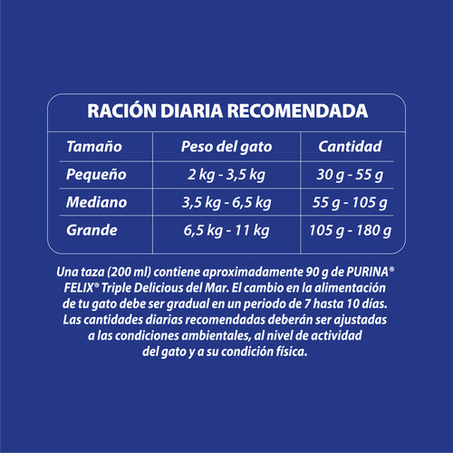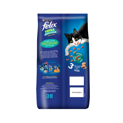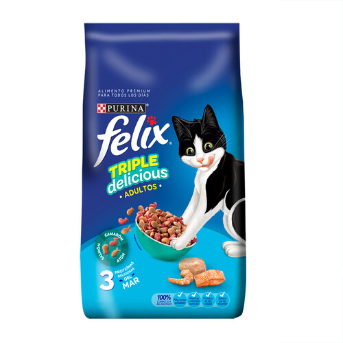 Purina Felix Triple Delicious Mar incluye 3 irresistibles proteínas, camarón, salmón y atún, para los gatos que lo quieren todo.